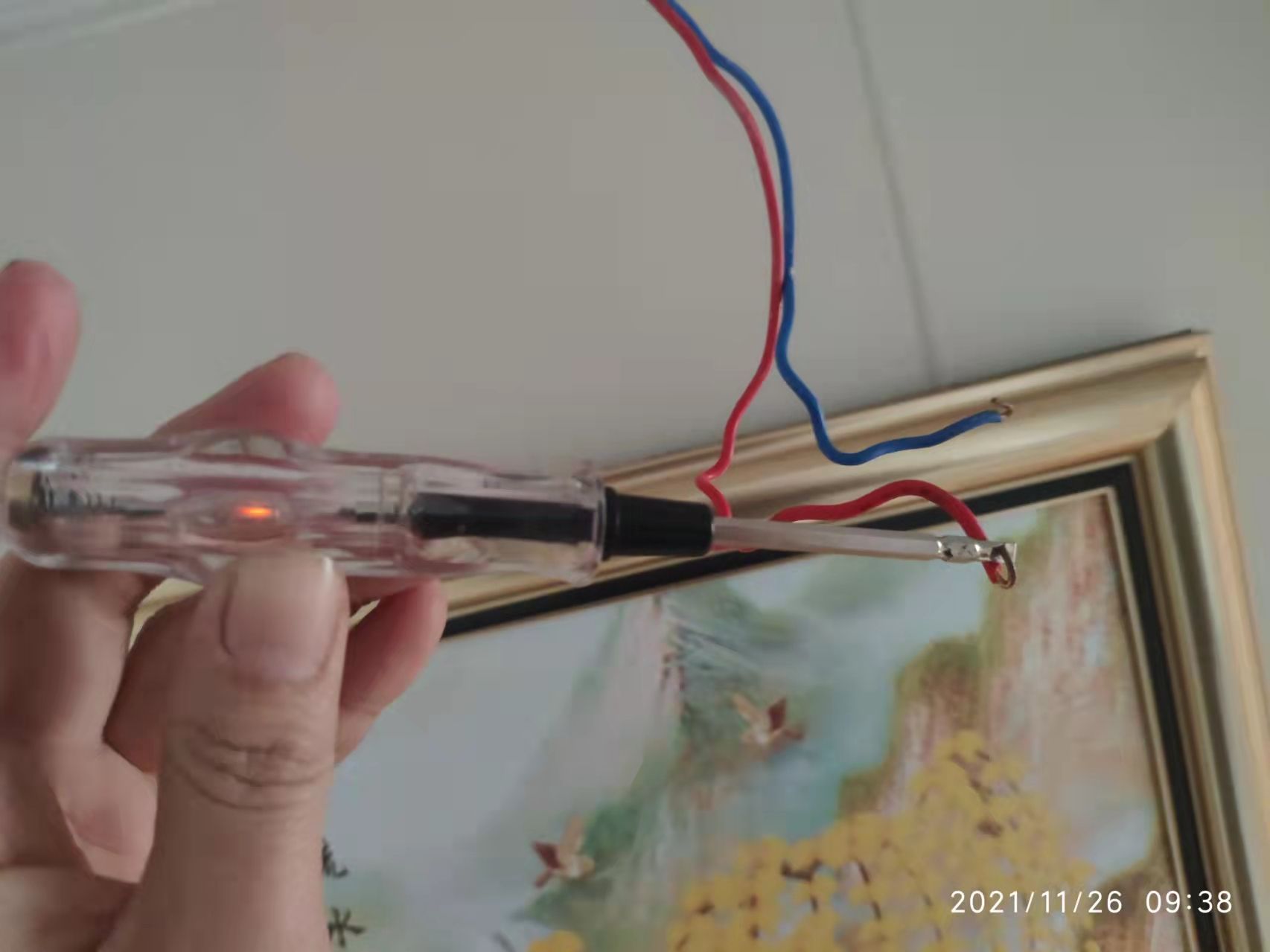 第三步,这一步也是比较危险,将零火两条线分开,打开开关,用电笔测量火线是哪一根。