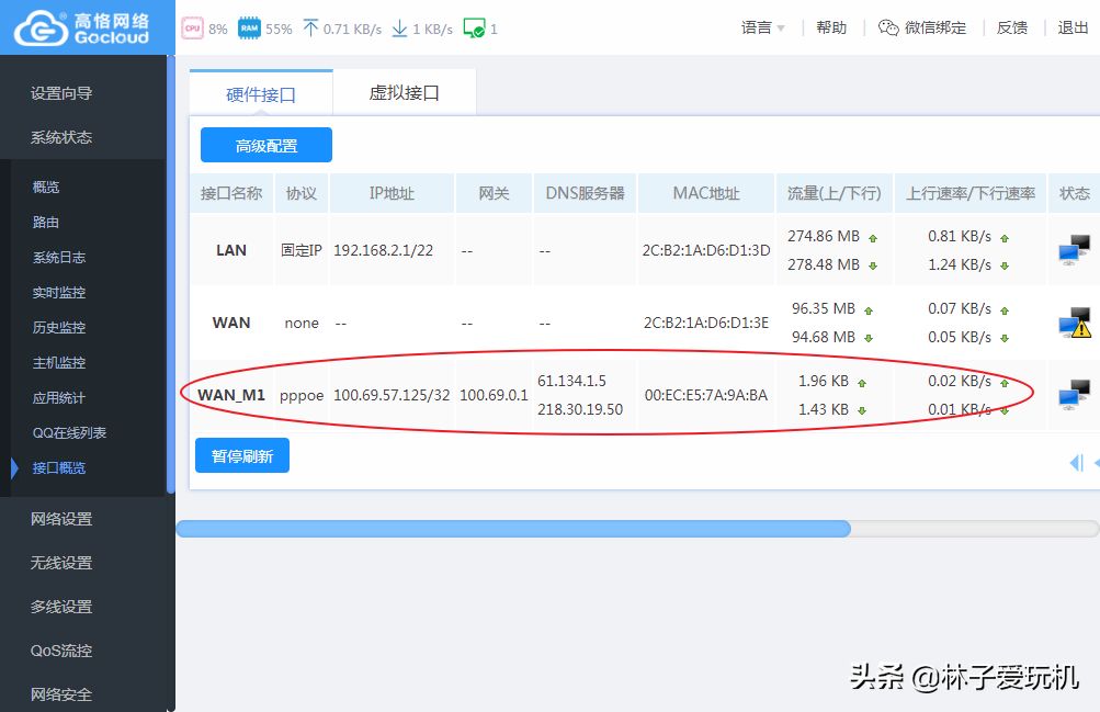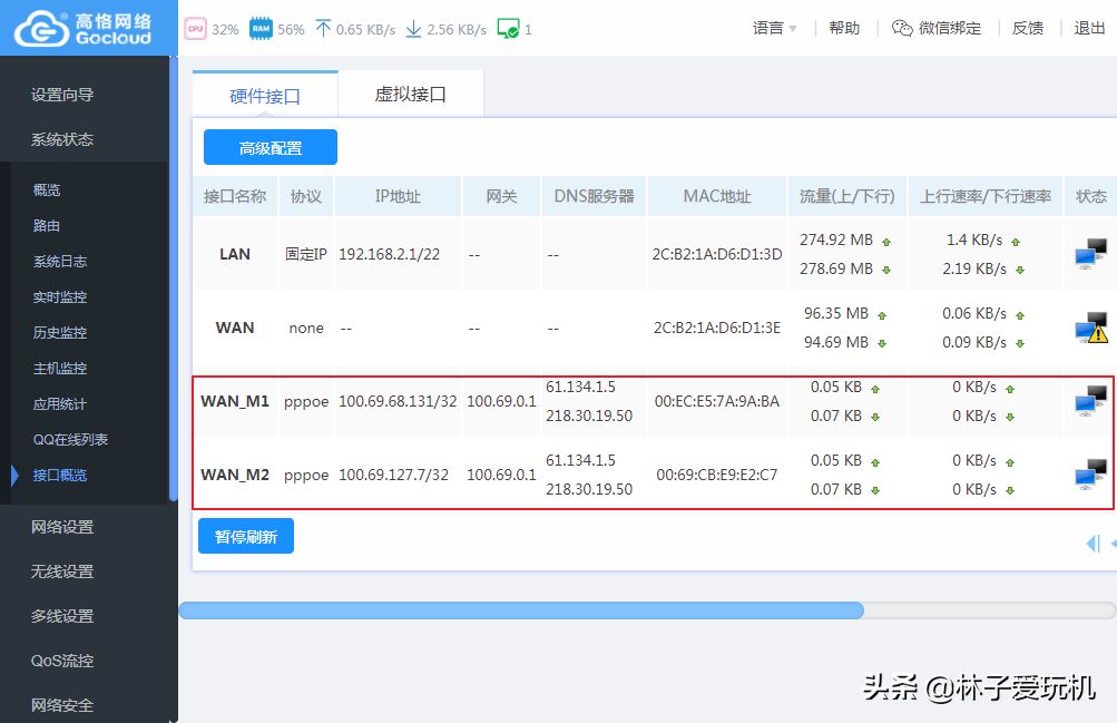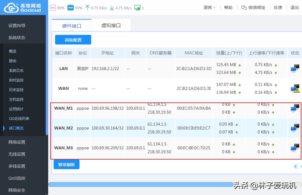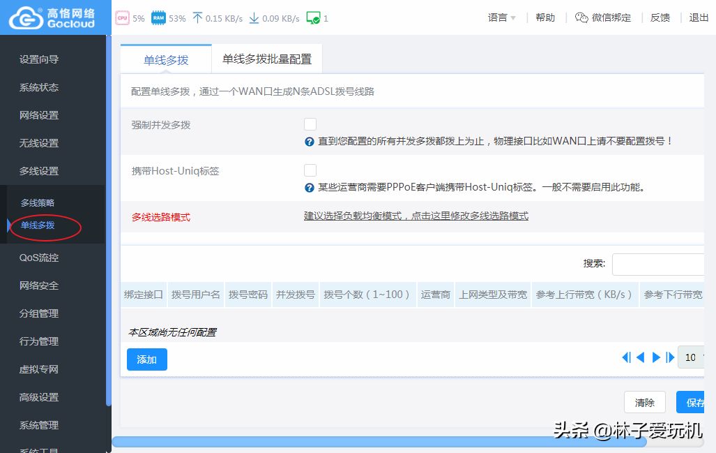 高恪固件系统多线设置中提供了:多线策略、单线多拨,我们先来看看单线多拨使用于什么情况呢?(单线多拨)可实现一个宽带账号带宽倍增;比如用户在只有一个宽带账号的情况下,利用运营商漏洞同时多次并发拨号(拨成功几次,带宽就乘以几),通过一个WAN口生成N条ADSL拨号线路,从而达到带宽倍增的目的。下。
