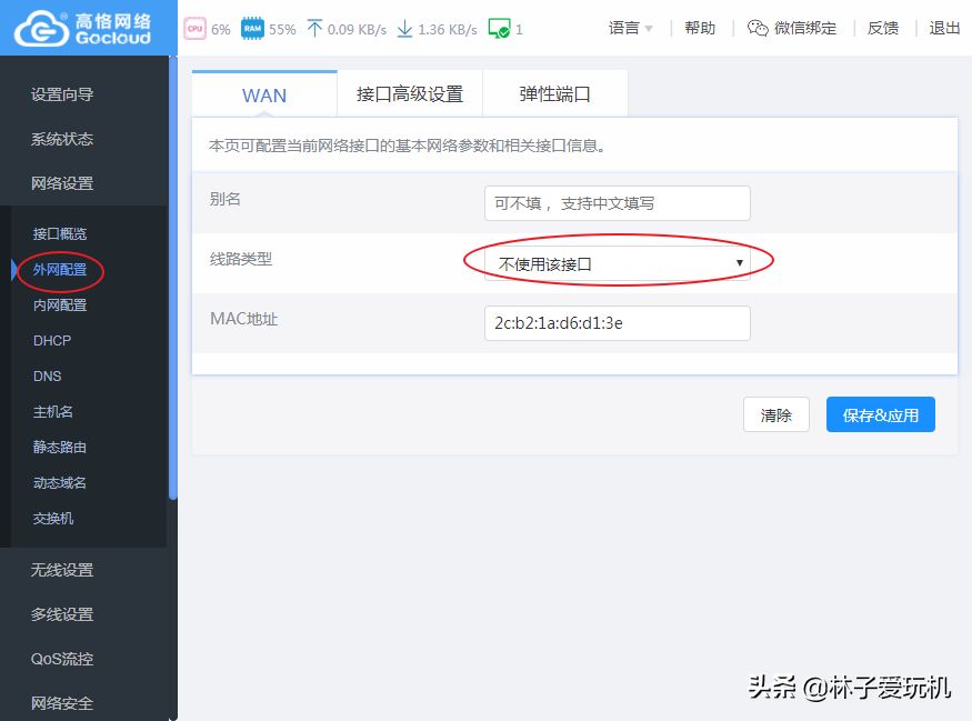 先配置网络设置中的WAN口设置,线路类型中选择不使用该接口,然后保存应用。