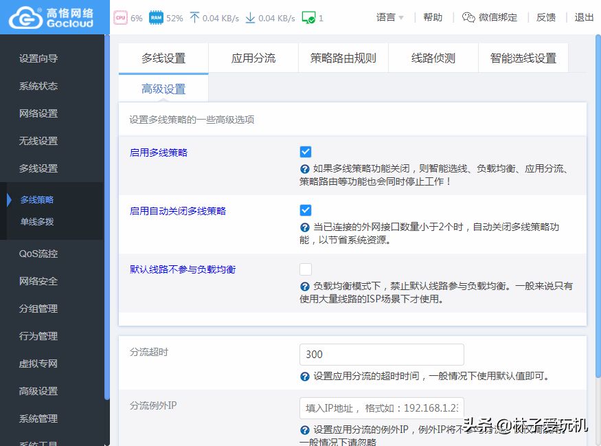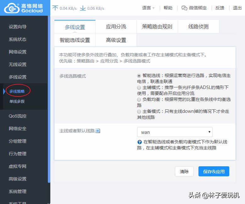 在多线策略中提供了:多线设置、应用分流、策略路由规则、线路侦测、智能选线设置、高级设置等功能。