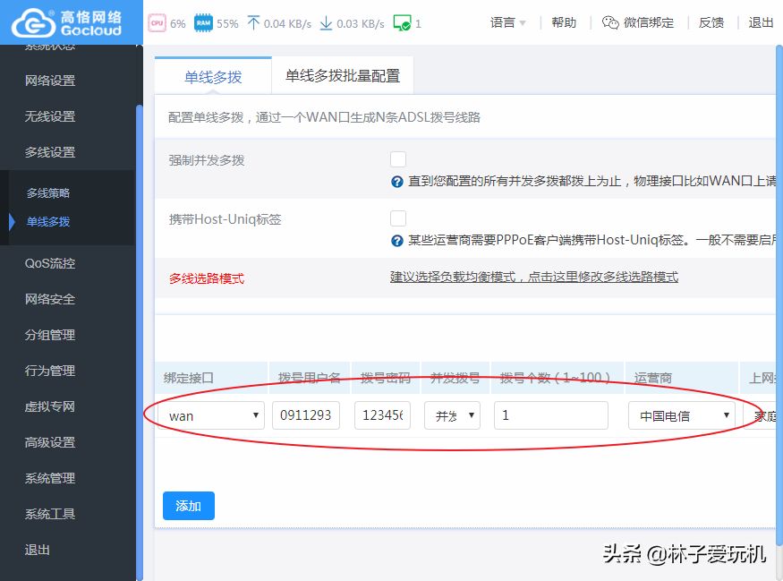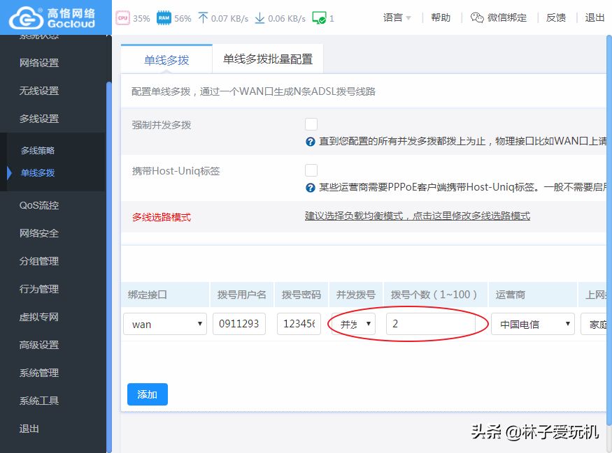 多线设置中单线多拨中,输入宽带账号和密码,并发拨号的方式,拨号的次数,单次拨号效果如下: