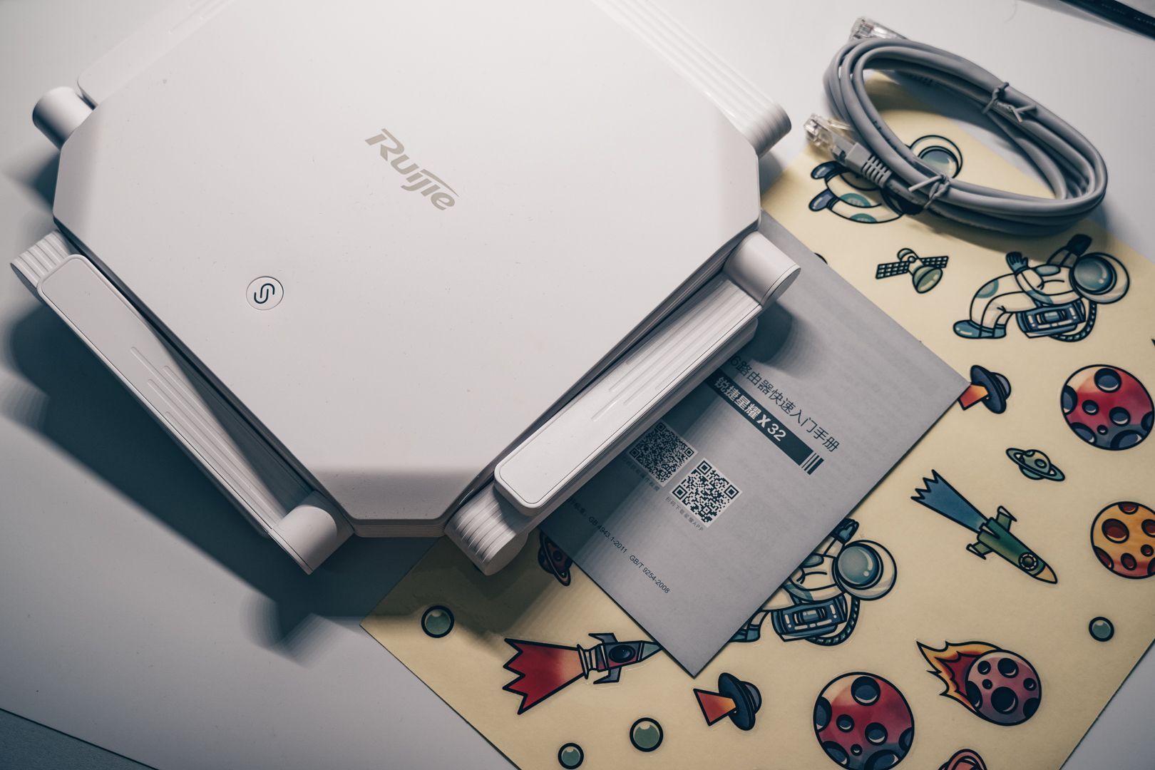打开锐捷星耀X32路由器的包装盒,可以看到包装内有路由器主体、一张贴纸、电源适配器、一根网线以及使用说明书,可以说是应有尽有,拿到手之后可以直接连接网线进行使用。