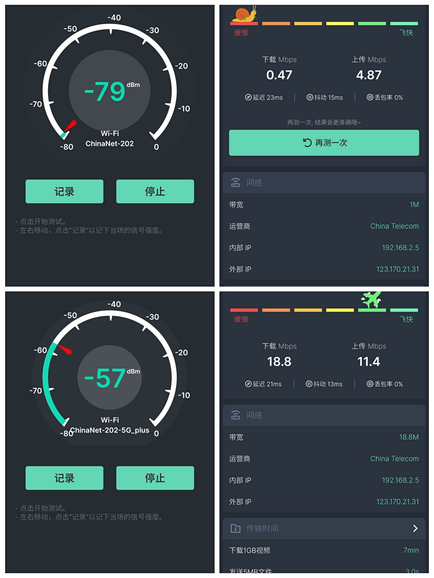 在没有锐捷小兔子的时候,主卧卫生间的信号非常弱为-79dBm,几乎没有信号,网络测试的速度为下载0.4Mbps上传4.87Mbps,锐捷小兔子接入网络之后,主卧卫生间的信号为-57dBm,测试速度下载18Mbps上传11.4Mbps,网络提升明显。