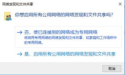 可以看到弹出如下窗口。如果该计算机是作为服务器一直开启的话,可以选择“否”;否则最好选“是”。如果选择“否”的话,要是网络发生改变,则可能导致共享失效。