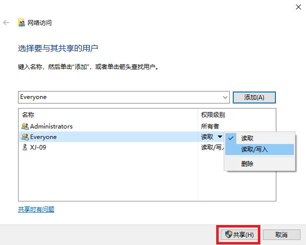 输入Everyone(所有人都可以访问),点击添加,把权限改为读取/写入,最后点击共享。如果不想所有人都能访问的话,可以选择相应的用户,这样在远程共享的时候需要输入相应用户名密码才能访问。