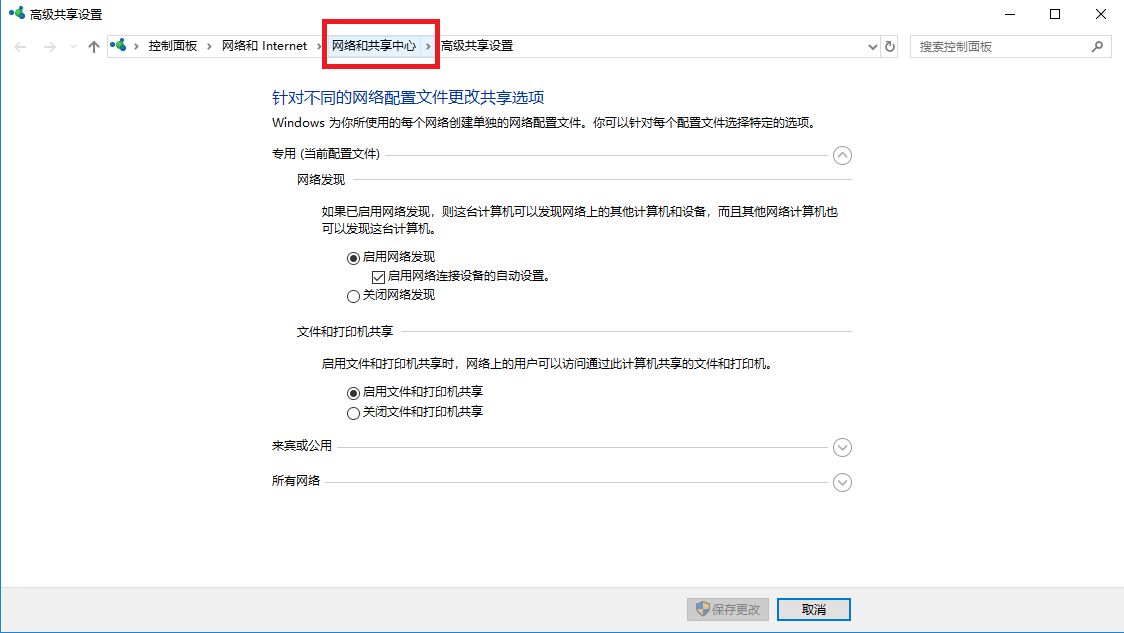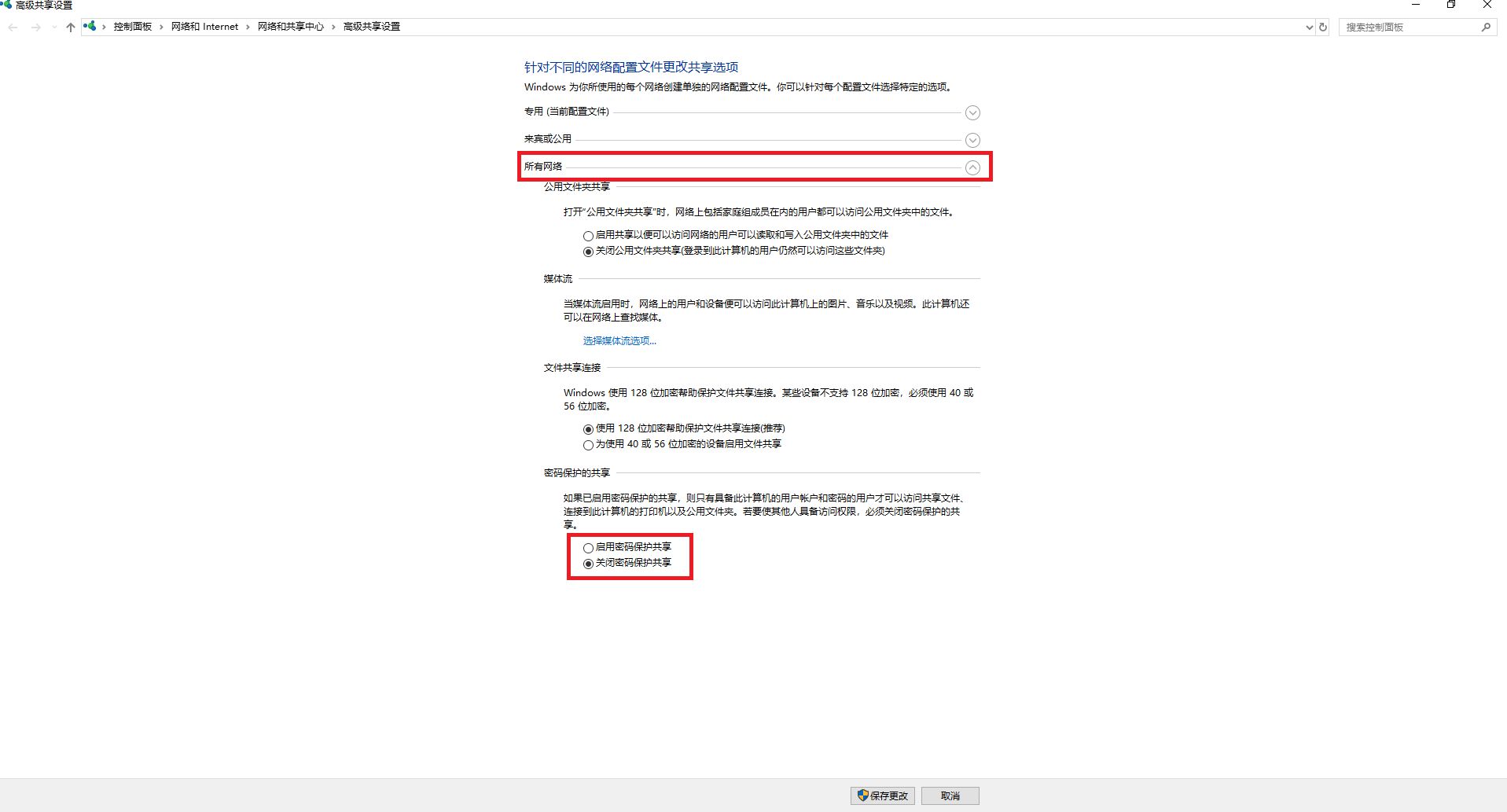 接下来点击“网络和共享中心”,点击展开“所有网络”,修改为不需要密码登录,保存更改。