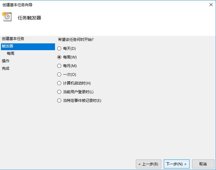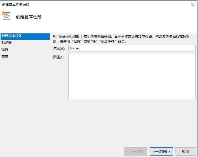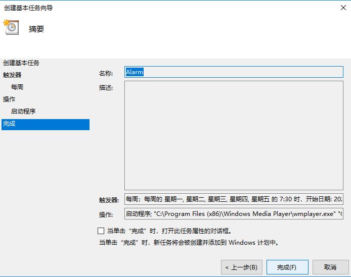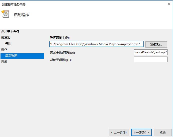 跟着向导一步步给出任务名称、触发器(执行时间)、执行什么操作(注意windows media player所在的目录和播放列表test.wpl所在的目录如何写)、