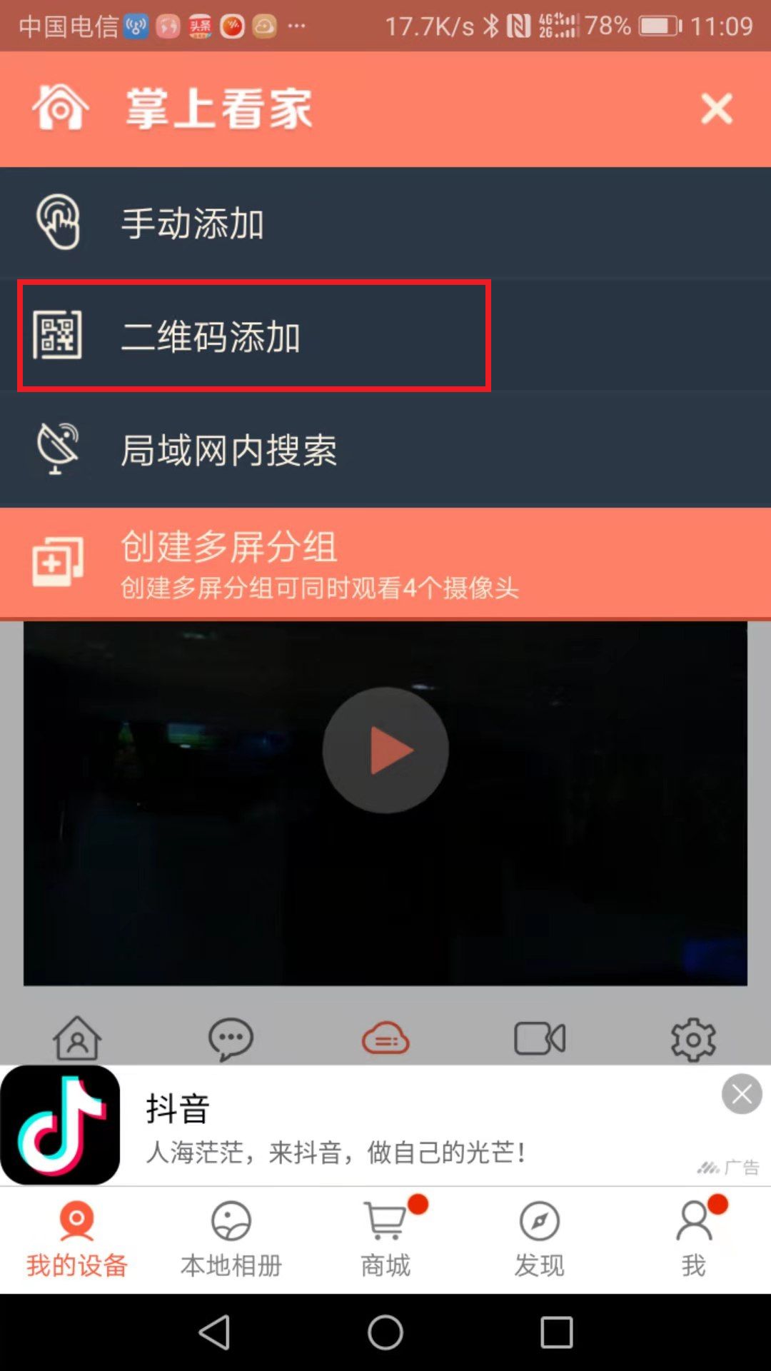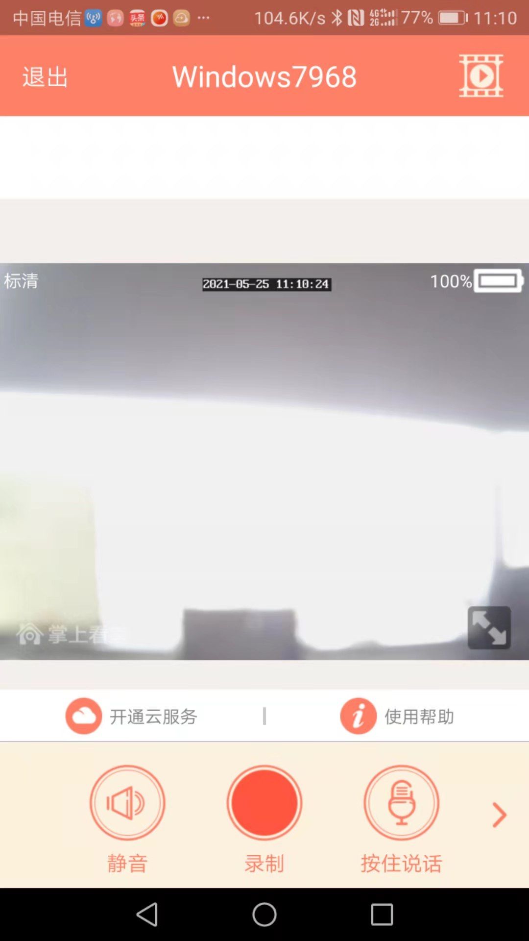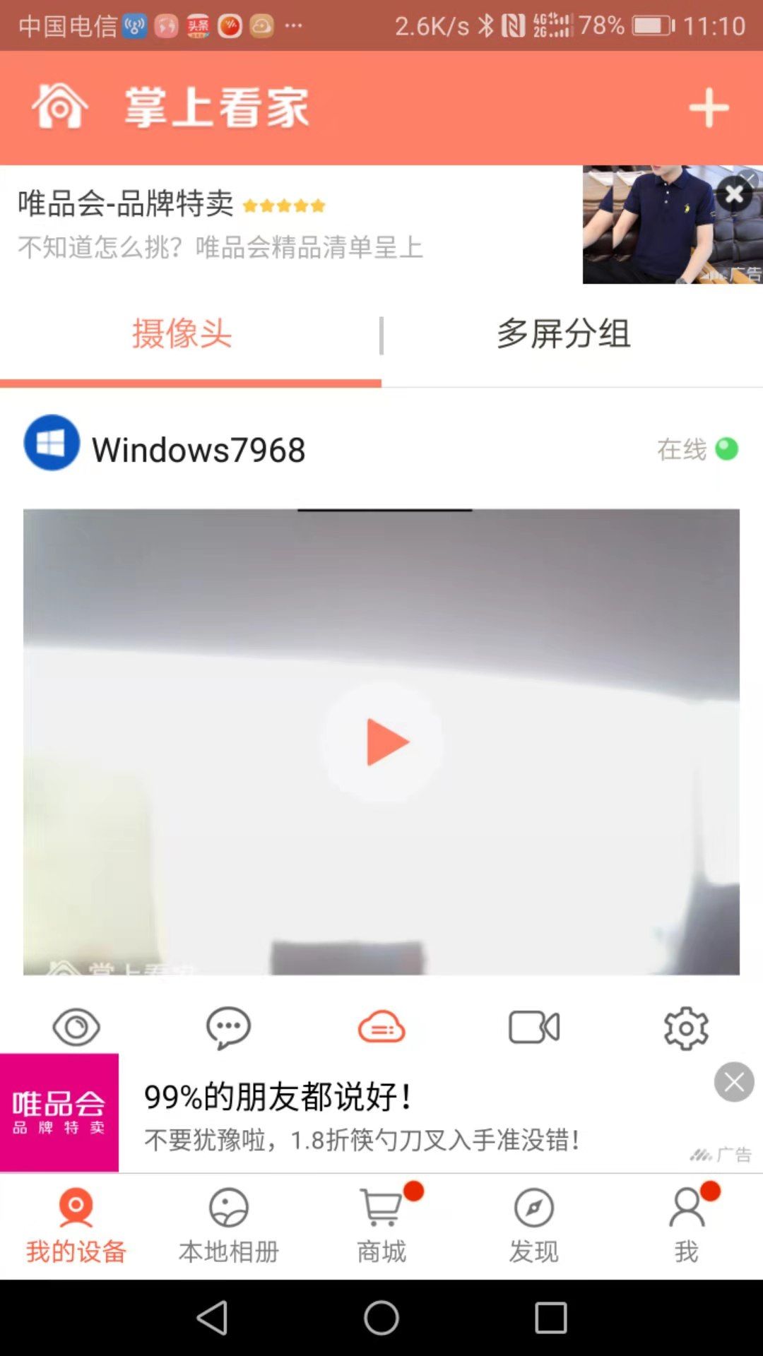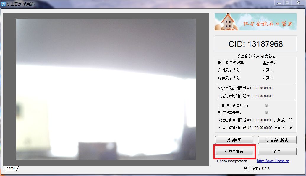 在电脑上运行掌上看家采集端,可以看到摄像头画面(下图中做了模糊处理)。点击生成二维码,然后打开手机上安装的掌上看家,点击右上角“+”号,扫描二维码,即可添加用于监控的笔记本电脑。点击相应的画面,即可看到监控画面进行监控。