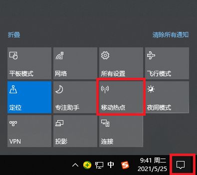 win10自带此功能,直接点击右下角消息按钮,打开移动热点开关。