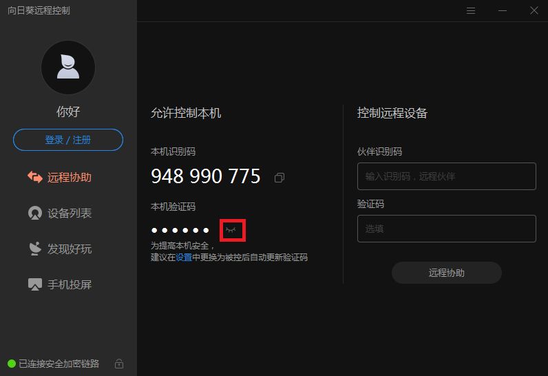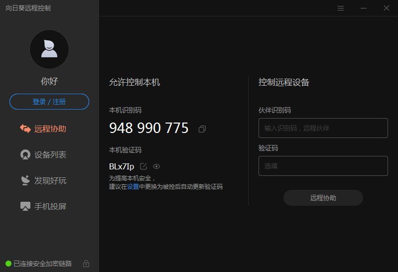 下面以手机控制电脑为例进行说明。在电脑上安装向日葵后运行,记住本机识别码和本机验证码。