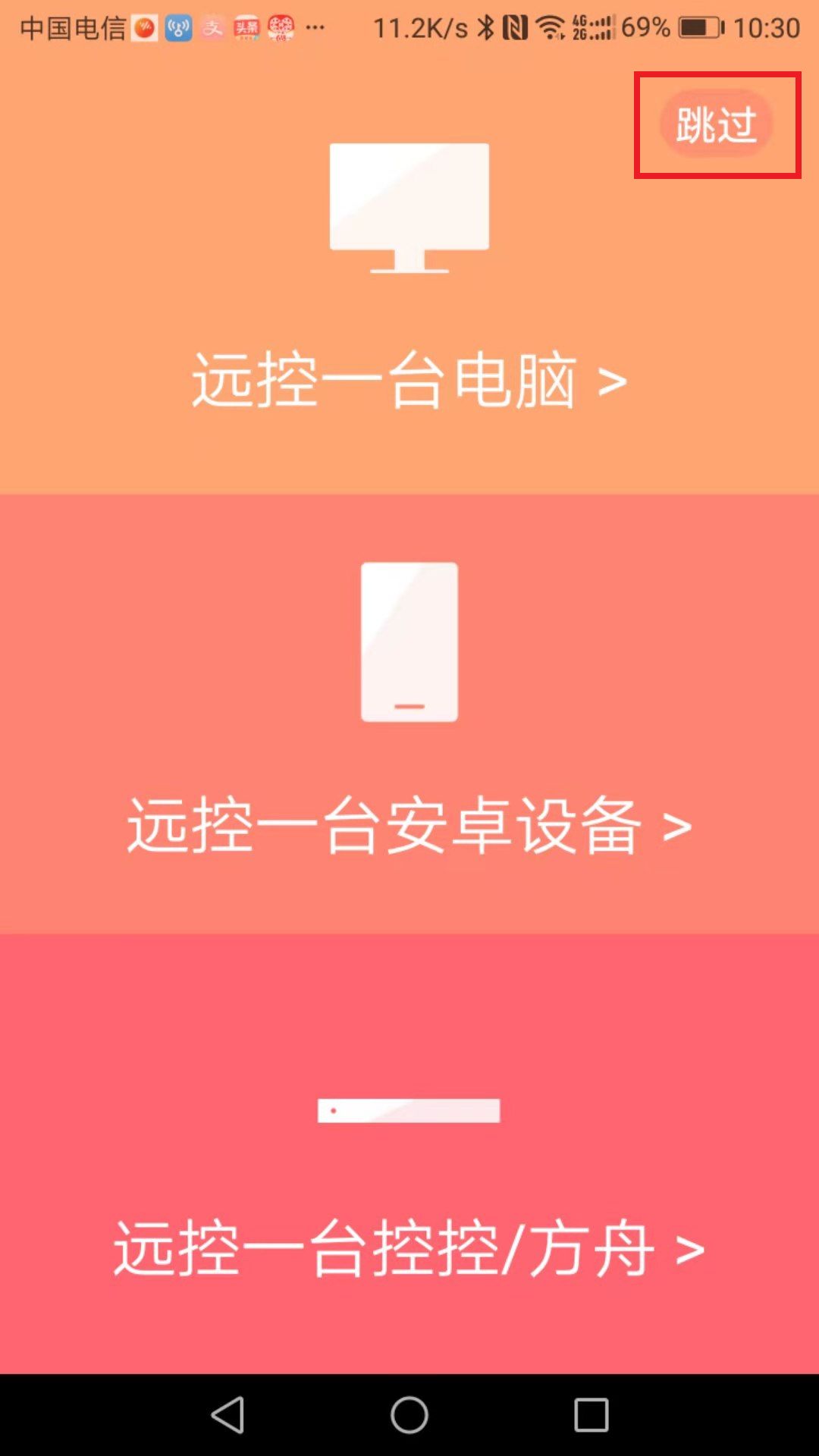 在手机上安装向日葵远程控制,打开后点击“跳过”。选择“远协”,输入识别码和验证码,点击“远程协助”,即可进入远程计算机桌面。