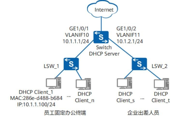dhcp server static-bind ip address 10.1.1.100 mac-address 286e-d488-b684 #为client_1分配固定的IP地址。