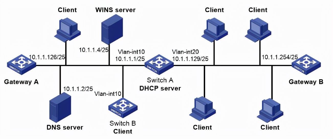 #配置DHCP地址池1,用来为10.1.1.0/25网段内的客户端分配IP地址和网络配置参数。