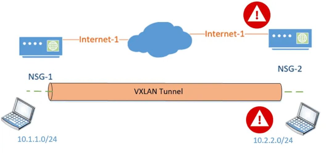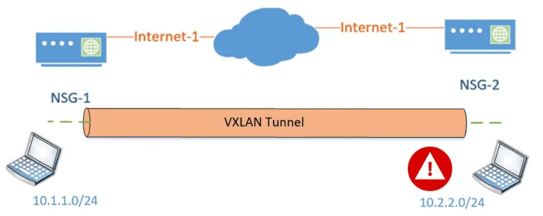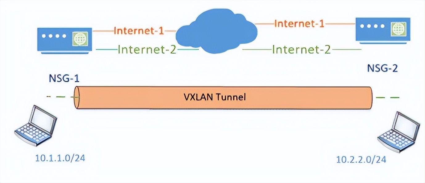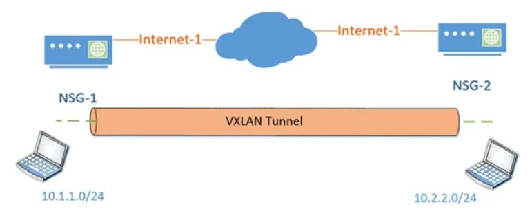 XLAN是否提供开箱即用的安全性?它没有。您通常不需要在数据中心进行任何加密,因为它是一个受信任的区域,但是如果您开始将VXLAN流量发送到Internet,类似于Nuagesd-wan的实施方式,您需要在其之上使用IPsec加密VXLAN隧道。下面的示例显示了两个overlay私有IP地址空间,10.1.1.0/24和10.2.2.0/24通过公共underlay路由(Internet-1。从最终用户的角度来看,他们不知道这些变化。