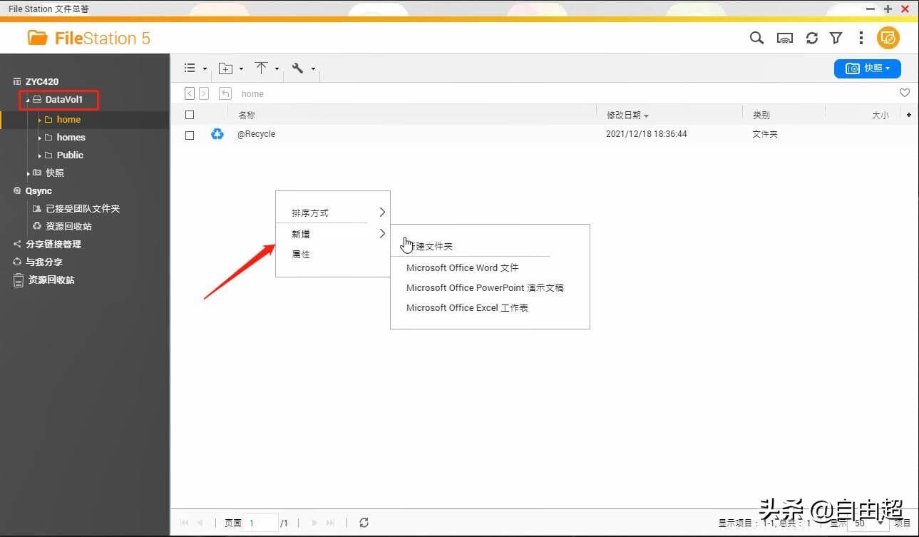 有了上面创建好的卷,我们才可以创建共享文件夹。相当于在windows分区C/D/E盘中创建文件夹。直接打开【FileStation】,可以看到刚才创建的卷DataaVol1下面自动生成了几个文件夹:home、homes、Public。这几个文件夹就是共享文件夹。我们也可以在共享文件里面新增减文件或文件夹。