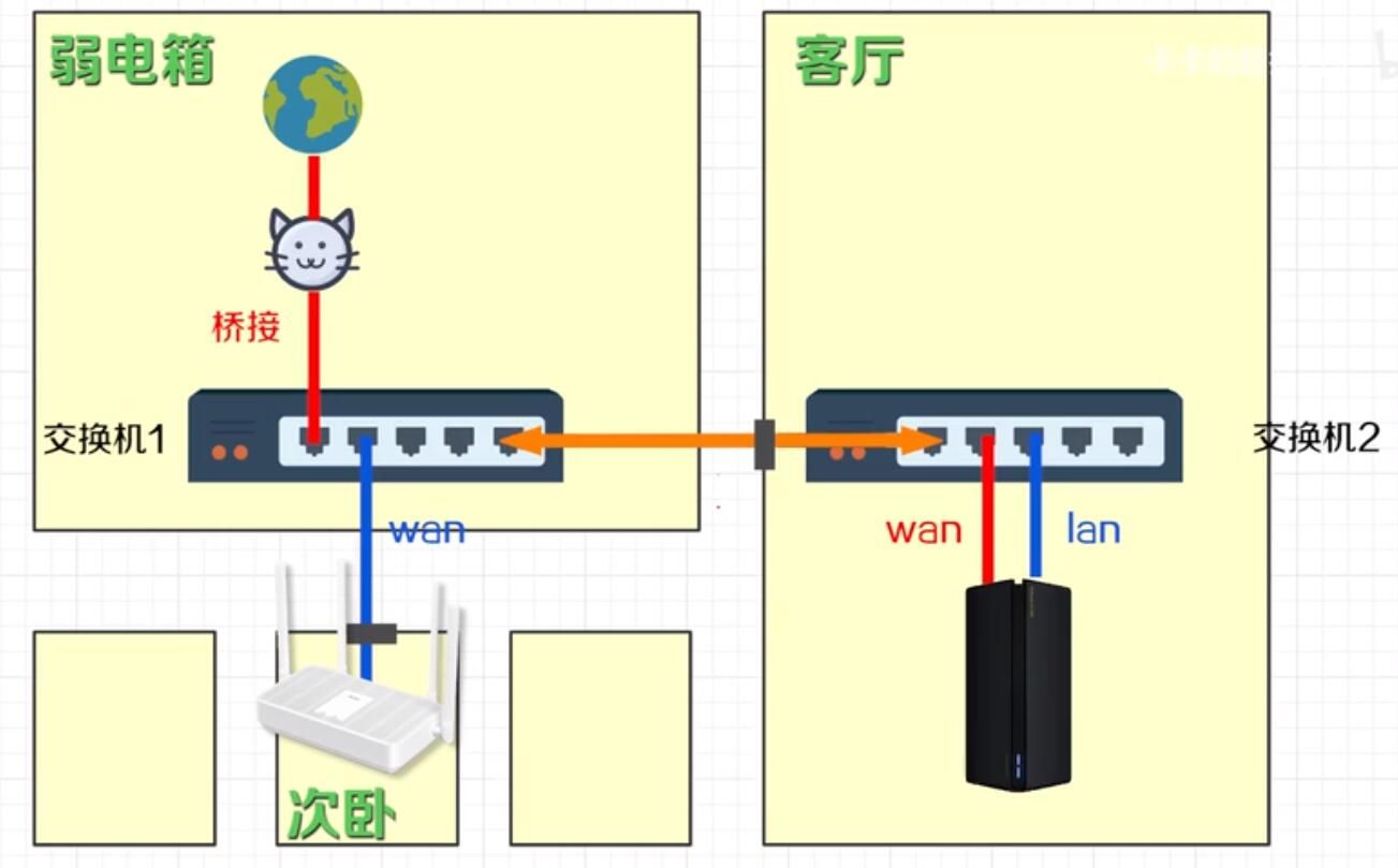 那么问题来了,我的弱电箱只有一根网线到客厅,怎么将客厅和次卧的网线连接起来呢?