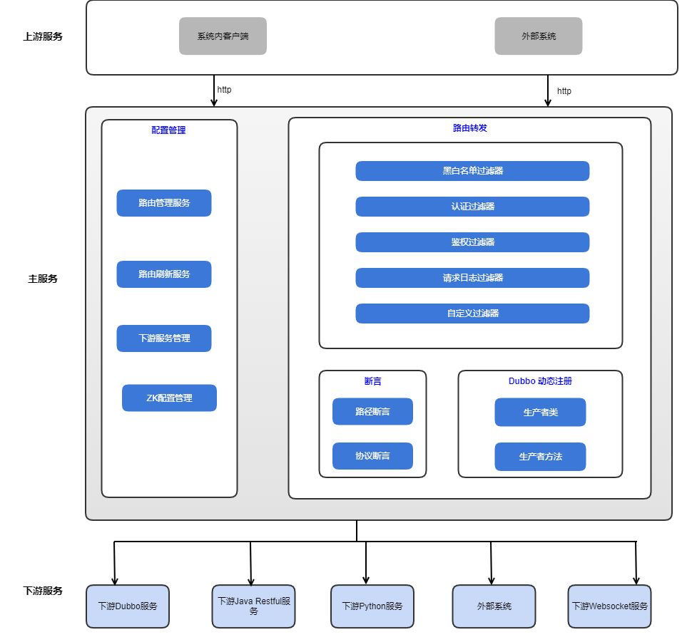 - 动态路由:动态路由需要同时支持http(s),websocket,rpc接口的路由转发,其中http(s) 和websocket服务转发通过动态路由配置实现。rpc接口服务调用通过自定义转发实现,所有的服务转发都要经过以下公共filter