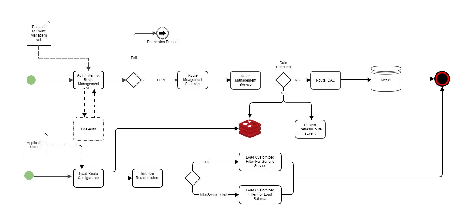 持久层:网关采用MySql持久化网关配置数据,路由管理服务接口通过Mybatis 框架集成数据库操作。同时网关采用redis作为分布式缓存。当应用启动时从Redis加载所有的路由配置装载路由对象(RouterLocator)。当通过路由管理服务接口使路由规则放生变化时,通过redis通知网关其他服务节点更新RouterLocator对象。