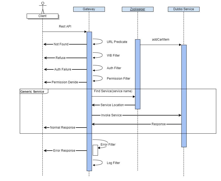除了异常每个路由都要经历的filter外,不同协议的转发还可以定制各自的filter实现转发,例如rpc协议服务的转发通过自定义的filter实现dubbo接口的泛化调用,http(s) 和 websocket协议的转发通过自定负载均衡过滤器确定转发地址