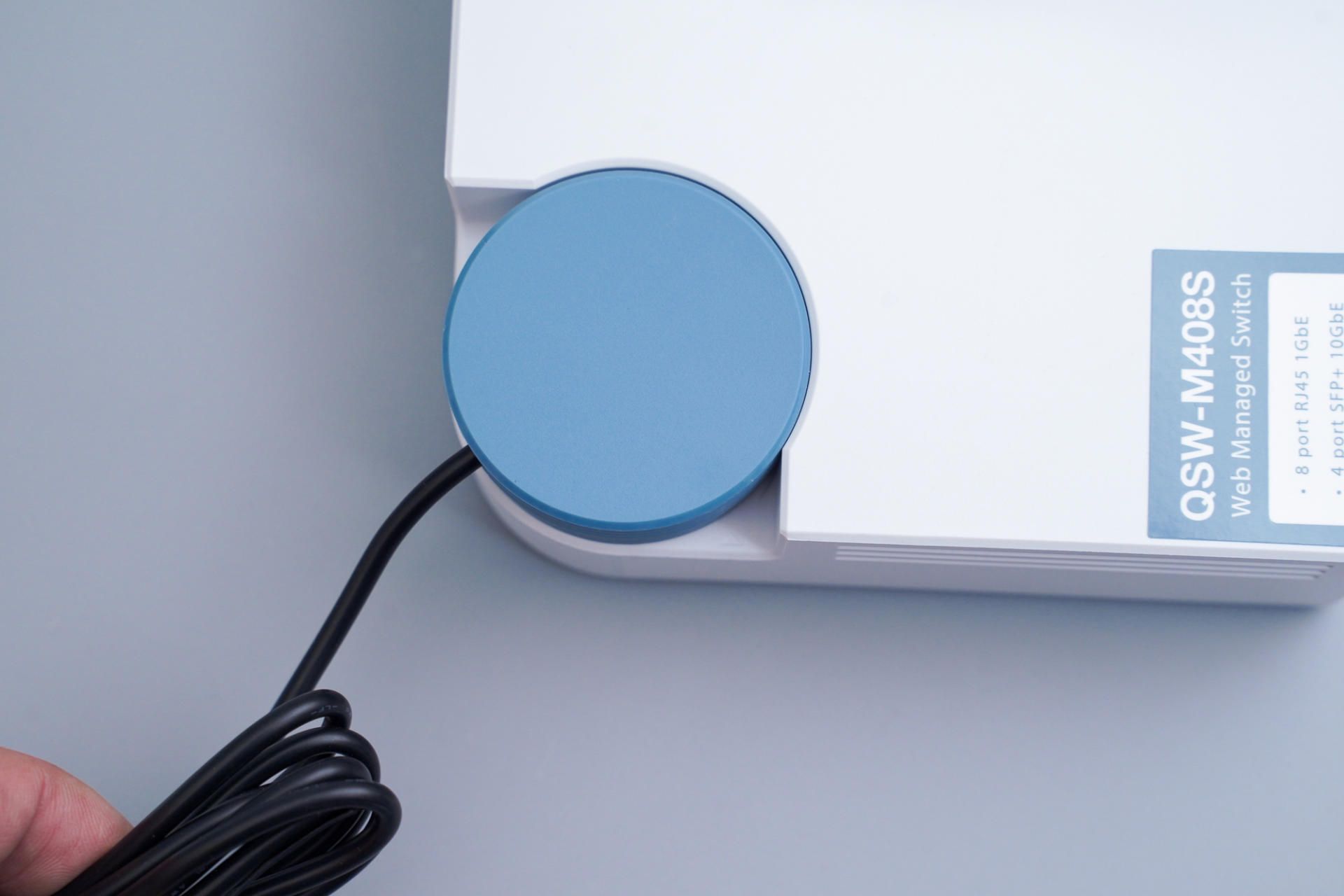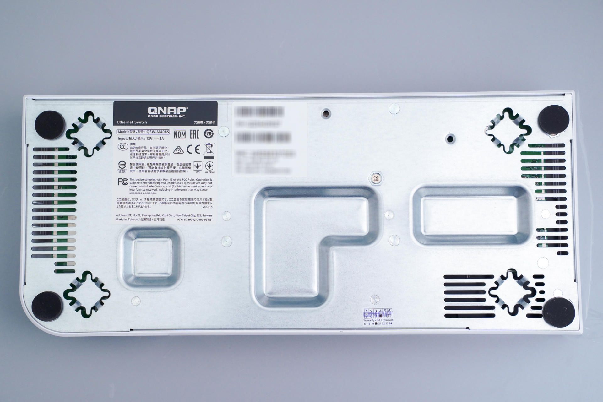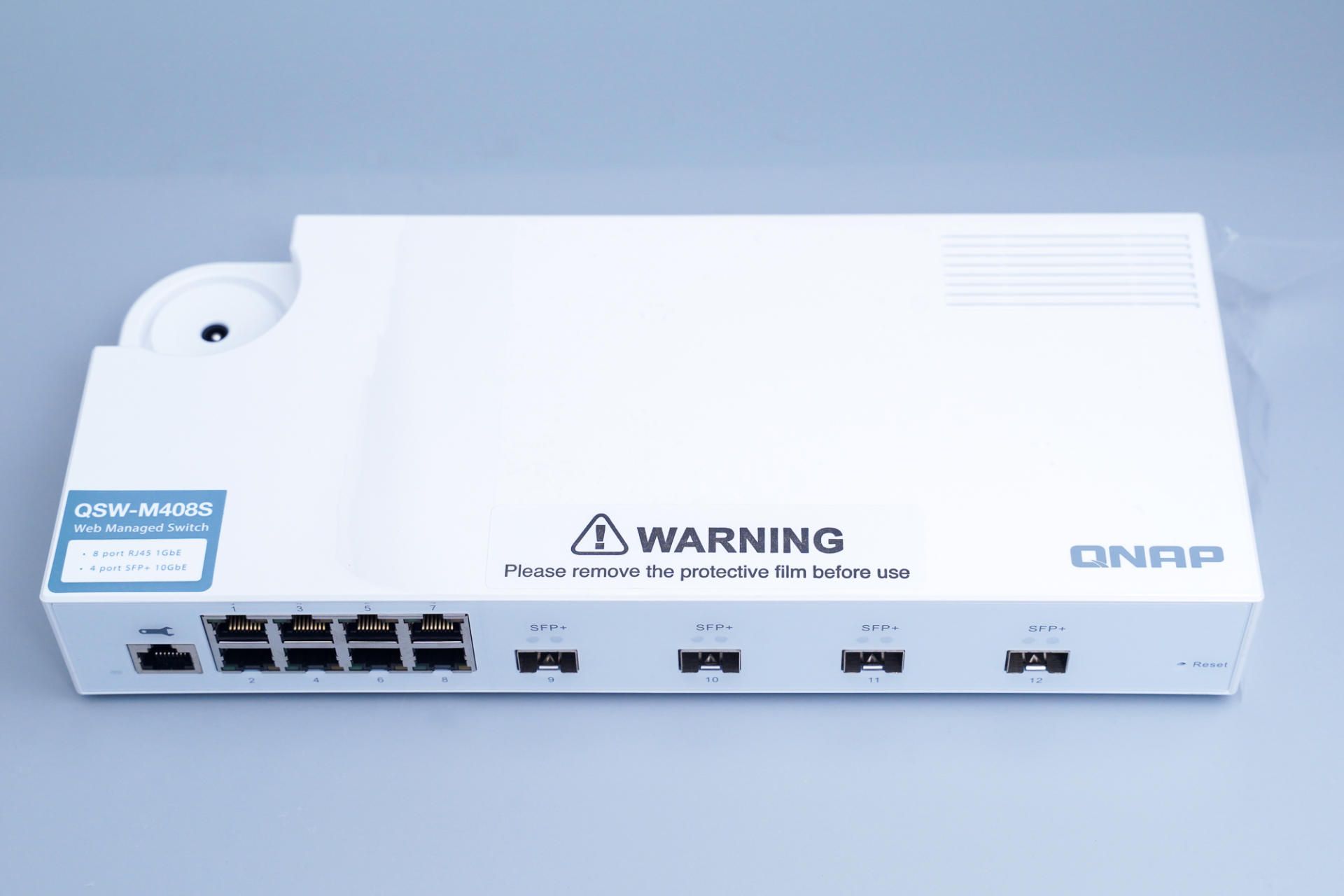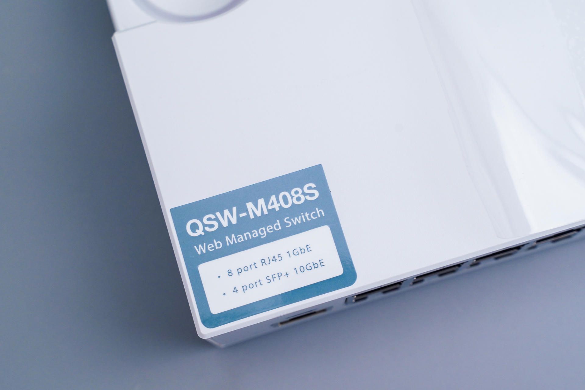 7、左下角,还有QSW-M408S的型号贴纸,上面也标记了8个千兆网口和4个10G万兆网口: