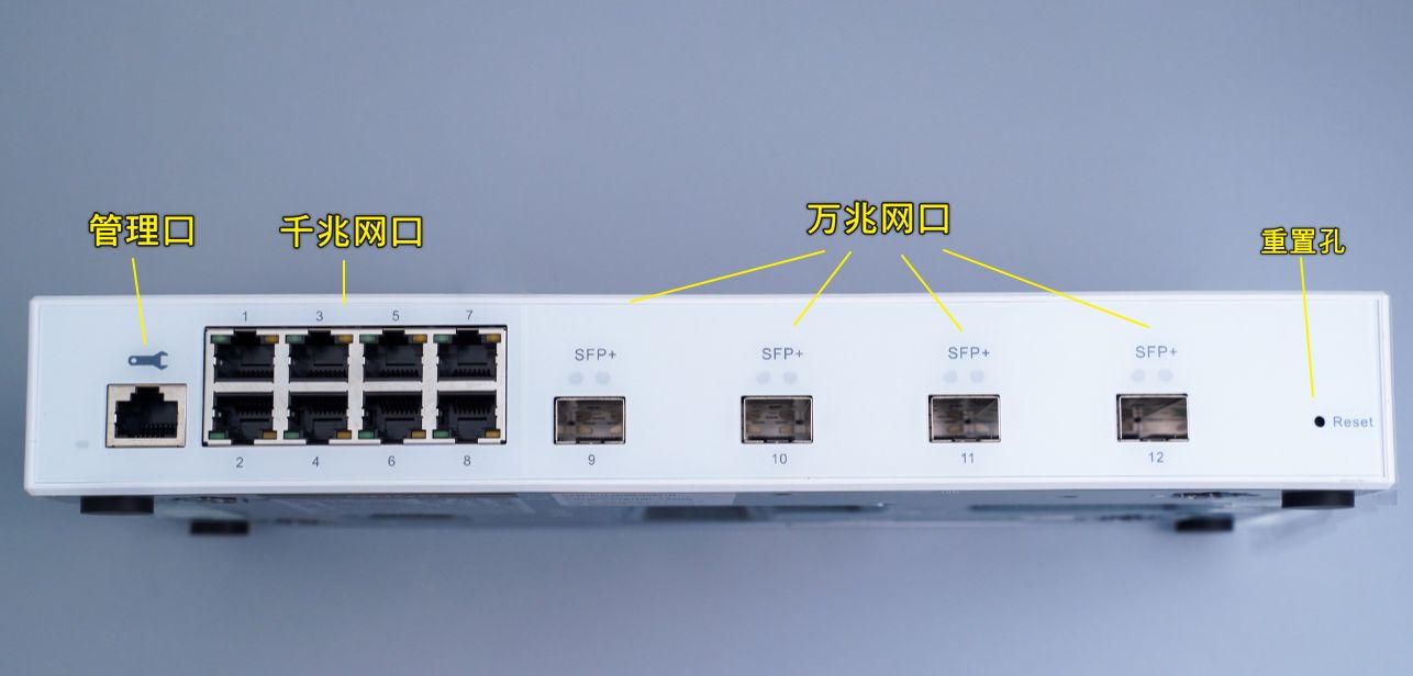 从左到右,分别有1个管理口、8个千兆网口、4个万兆网口、以及一个重置小孔:
