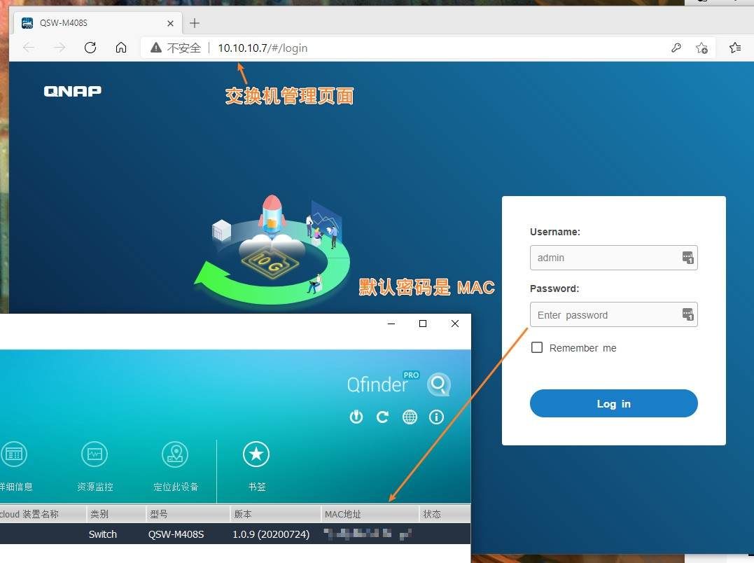 这个MAC地址,可以在交换机背后查看,或者在Qfinder中看到: