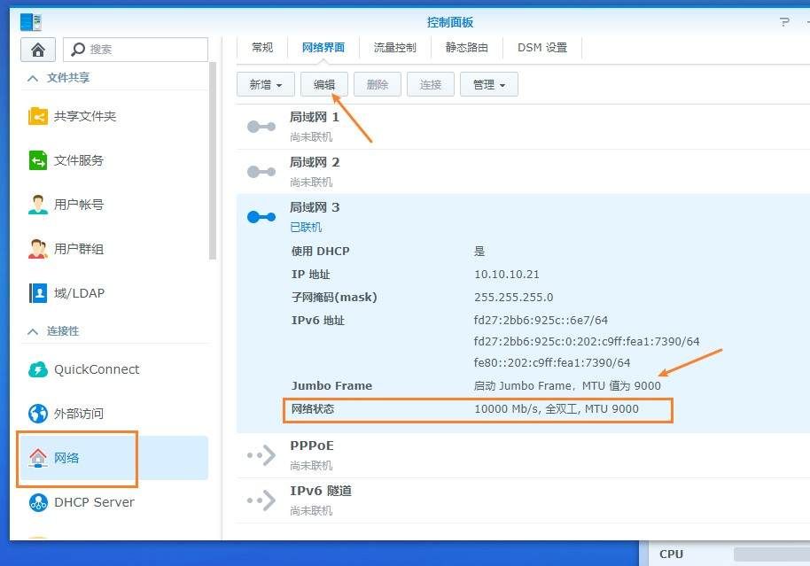 7、在网络设置中,也需要将MTU从1500的值改成MTU 9000: