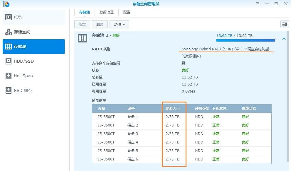 6、NAS方面,我使用的是黑群晖NAS,有6个3.5寸的机械硬盘,并且组了SHR阵列: