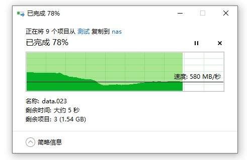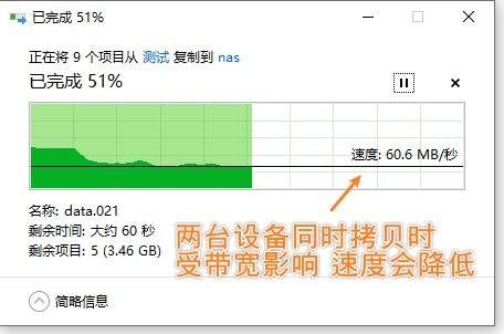 10、这里,我进行了一个测试,当我家里有2台电脑,或者1个电视盒子在播放NAS电影,1个电脑在进行拷贝文件,速率因带宽不够,会进行降低,只有60MB/s:
