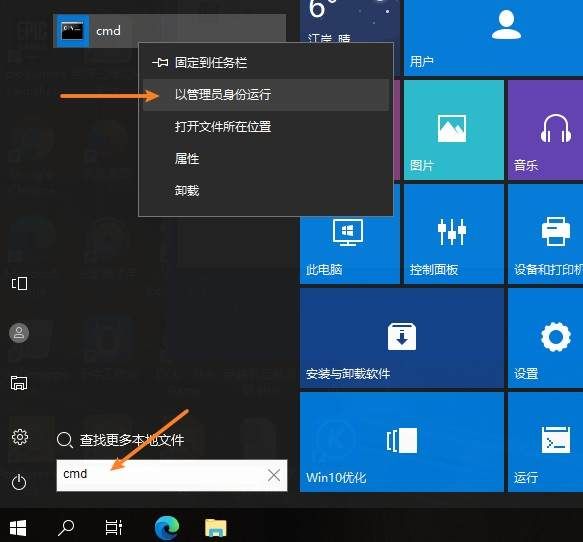 8、然后在电脑左下角搜索cmd,并且用管理员的身份运行: