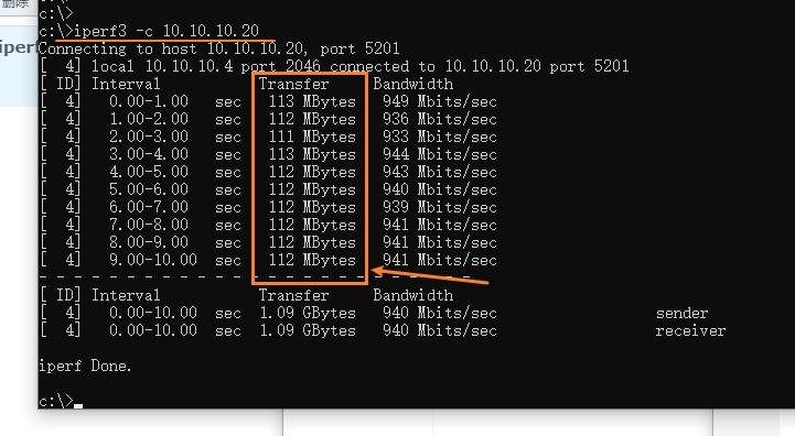 11、然后,我又测试了一下万兆的网口速率,稳稳的 1.14 GBytes,说明交换机的交换能力可以跑满万兆带宽:
