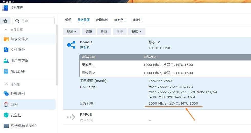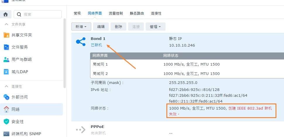 9、然后返回到NAS的网络页面,可以看到聚合的网络状态已经成功了: