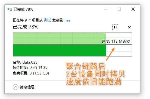 11、但是,我们经过链路聚合后的NAS,在内网下多个设备进行访问的时候,均可以保障其中一条线路能跑满千兆带宽,另外的线路进行分流,让多台设备,都能达到更高的速率:
