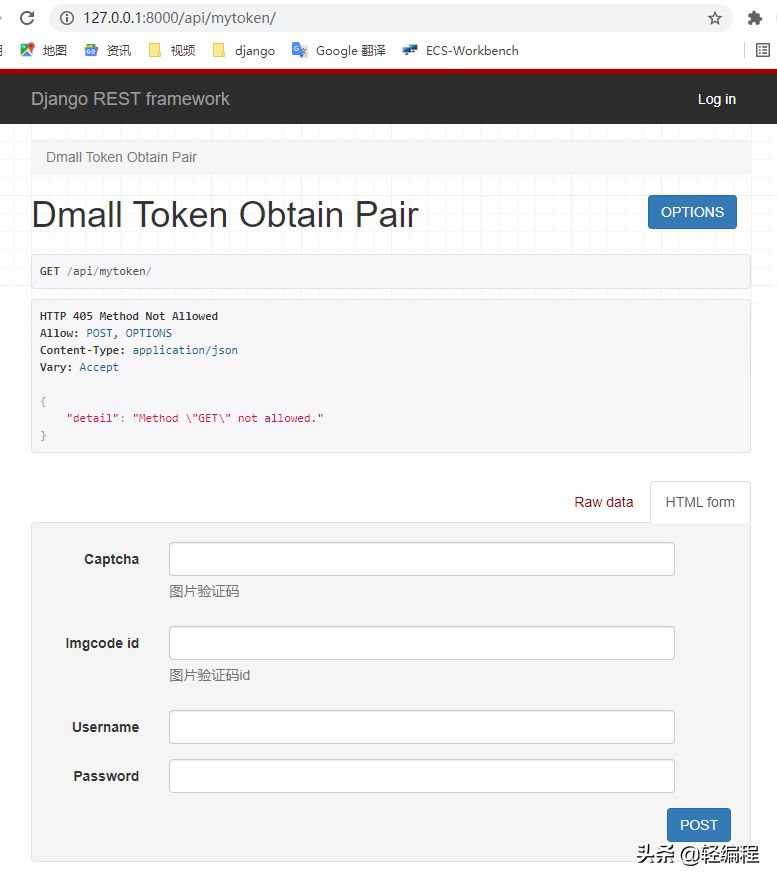 浏览器中访问登录接口可看到 登录接口视图允许提交username和password字段,需要验证码验证功能就必须得允许提交验证码并进行验证,这门这里的做法是重写TokenObtainPairView,先继承他并扩展验证码字段!