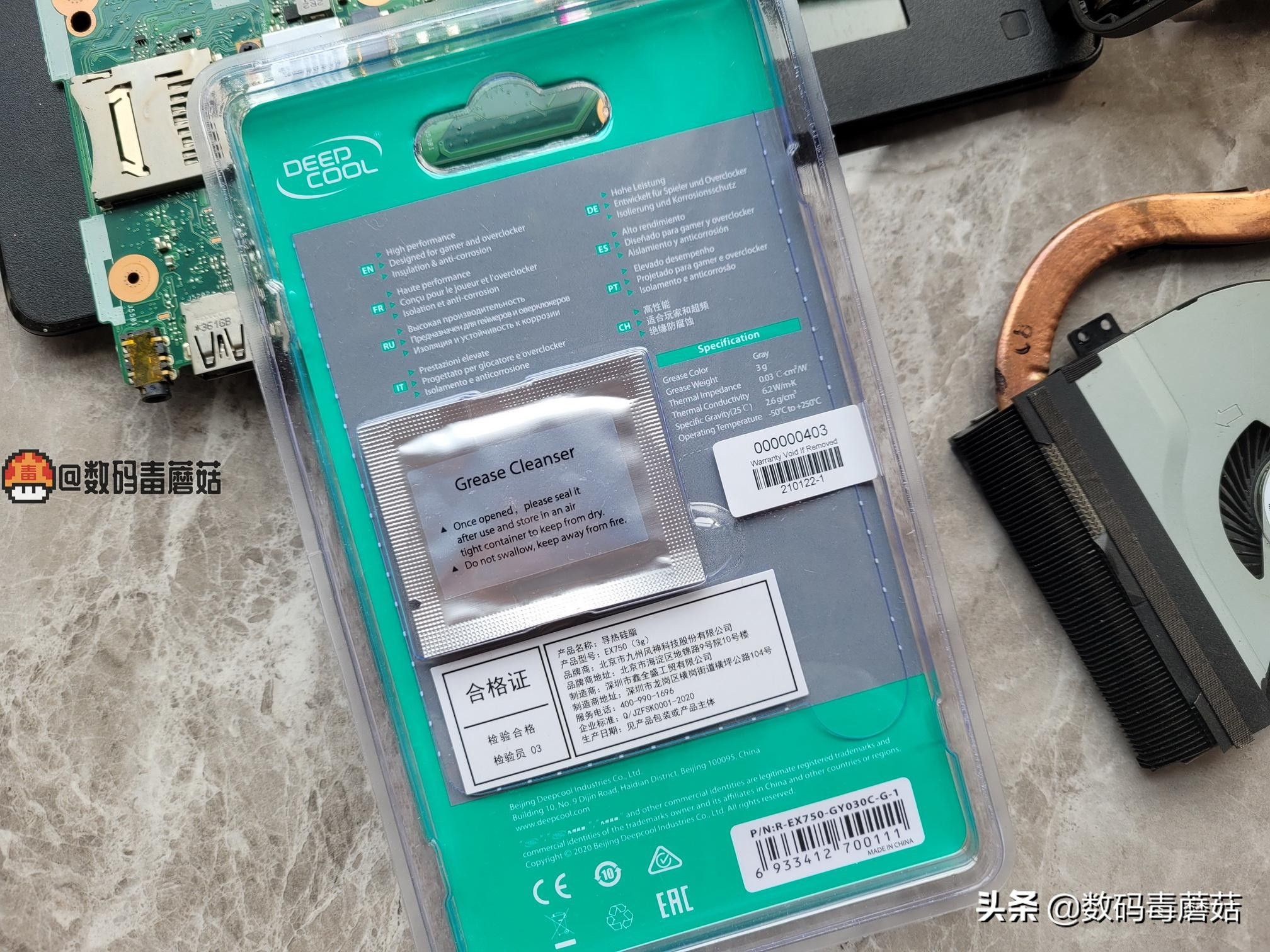 给高端处理器和高性能独立显卡重新抹点硅脂,来自九州风神的高端货,EX750,三十多块钱一盒带两管,一管能用3次,抹到这个笔记本上干脆就点了绿豆大小。