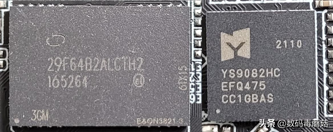放大看看。闪存颗粒来自英特尔的29F64B2ALCTH2,是64层堆叠3D-TLC颗粒,这个B17A颗粒不稀奇,稀奇的是主控,YS9082HC,实话实说,我还是第一次见。搜了一下,是得一微(深圳市得一微电子有限责任公司)新一代主控。看着这个版型布局看着有点像慧荣SM3258XT,不过用对应开卡工具无法认出。
