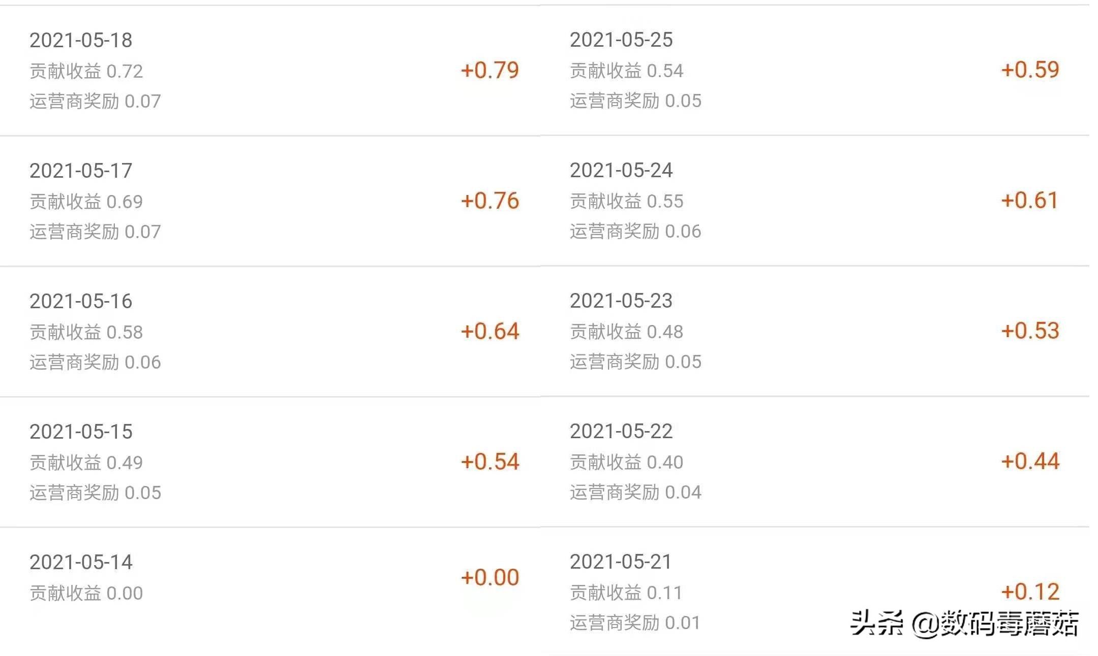 从14日挂机,收益是逐步上涨的,然后19号我嫌它屏幕常亮,扣了一次盖……然后人没在家,过了两天才发现掉线了,赶紧重新上线,于是就成了上面的样子。大约在缓存到80G以上之后,收益就非常稳定了,最新的收益我没截图,差不多一天一块五-两块之间吧。