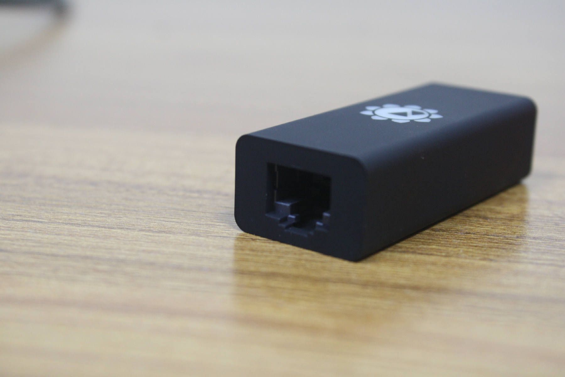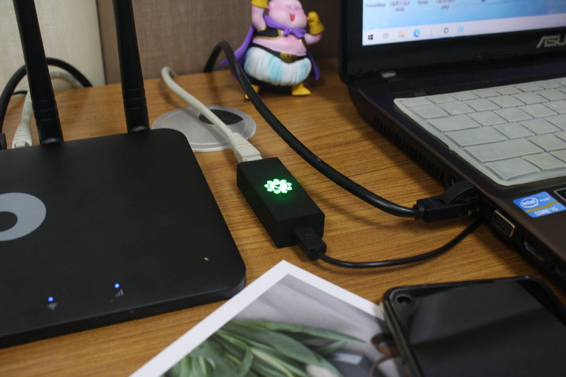 首先我们按照说明书连接开机棒,一端连接Micro-USB,并使用提前准备好的5V-1A通用电源适配器供电,另一端使用网线连接交换机或路由器。