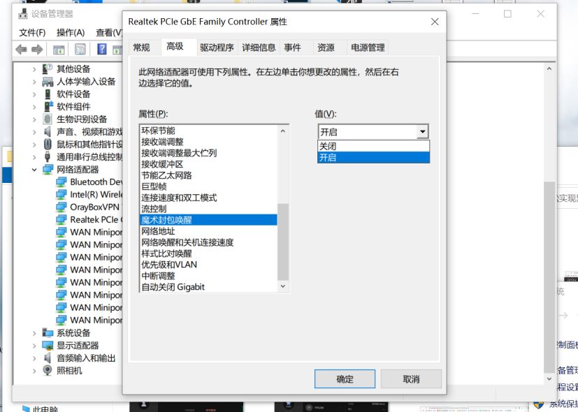 PC端我们准备远程开机并远程控制,所以需要在PC端进行两方面的设备:一方面是打开网络唤醒功能,以我公司里这台电脑为例,在设备管理器找到网卡,在高级属性里把网络唤醒设置为开启就可以了,这样就可以保证后面通过开机棒能远程开机了。
