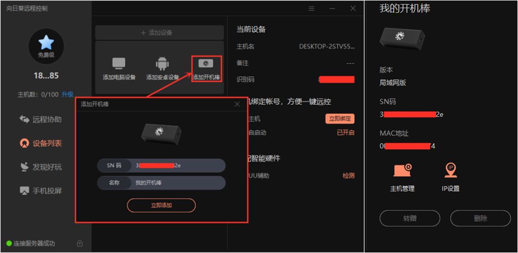 我接着在电脑上演示绑定开机棒的过程,从设备列表里,选择“添加开机棒”,输入设备SN码完成开机棒的添加。
