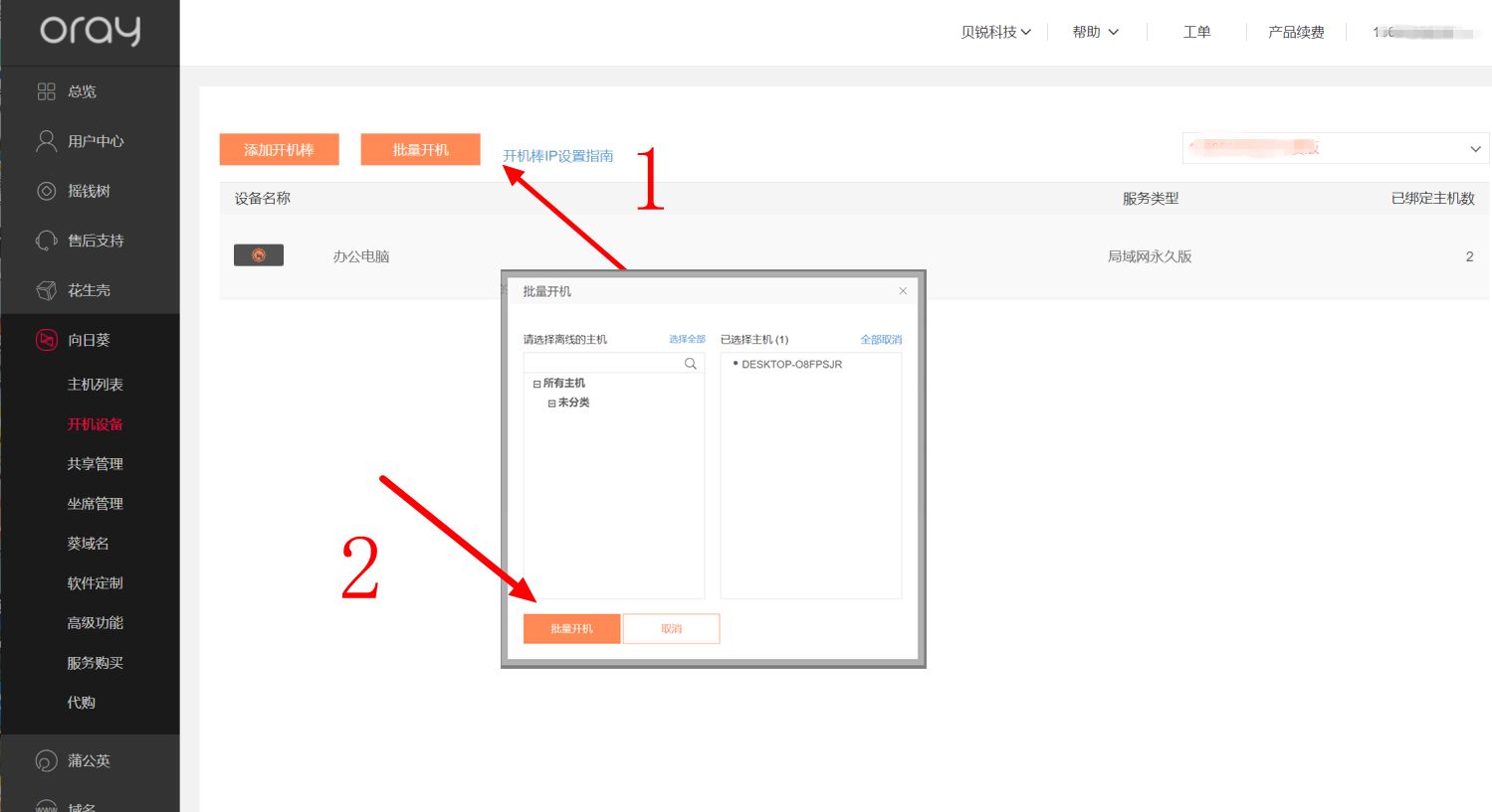 添加完开机棒之后,要怎么远程开机呢?可以用电脑控制,也可以用手机控制,批量开机的话,用电脑控制最方便,在向日葵控制台里有一个开机设备栏,在里可以找到批量开机,只要是未开机的设备都可以添加到列表的右侧进行批量开机。