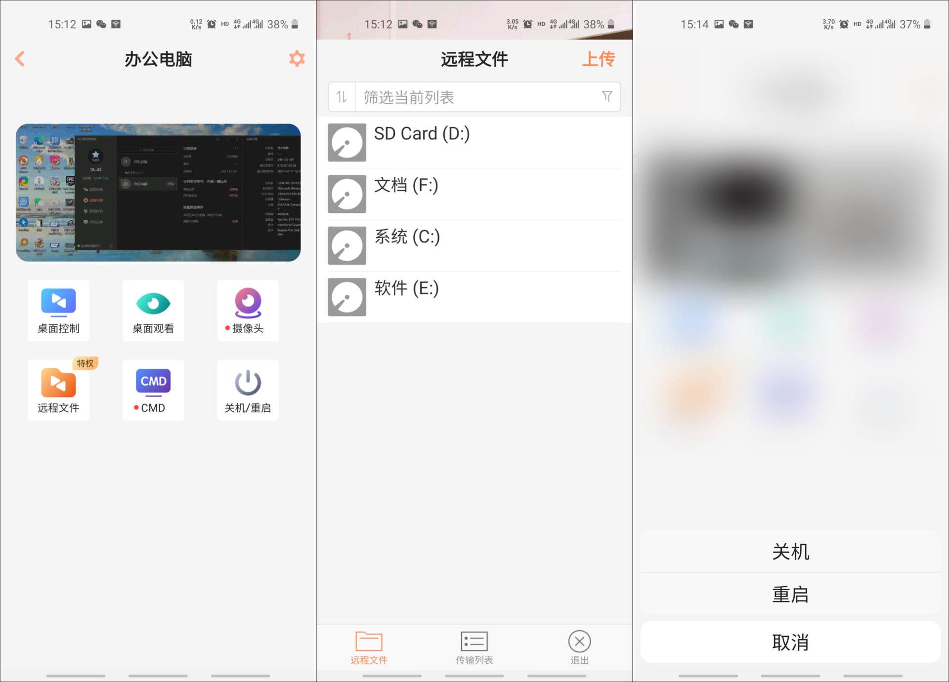 点一下设备,会打开设备的功能主页,目前可以实现的是手机端远程开关机,远程协助,桌面控制,桌面观看,远程文件管理,另外是需要付费的摄像头查看和CMD命令。
