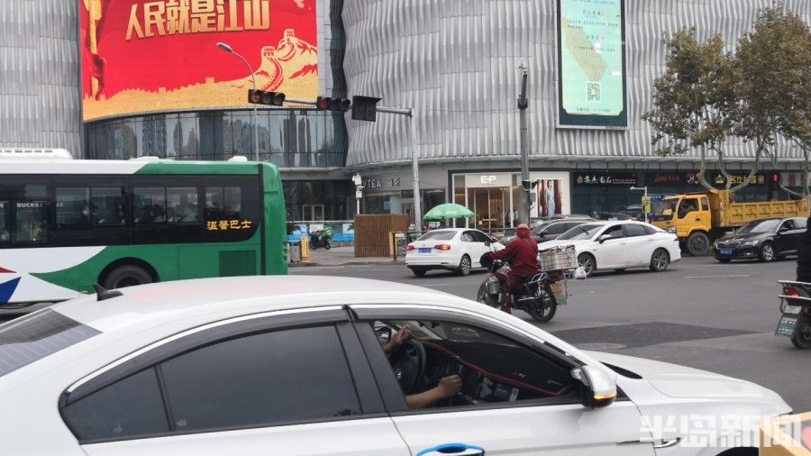 夏庄路大崂路路口横冲直撞骑手被困路中央