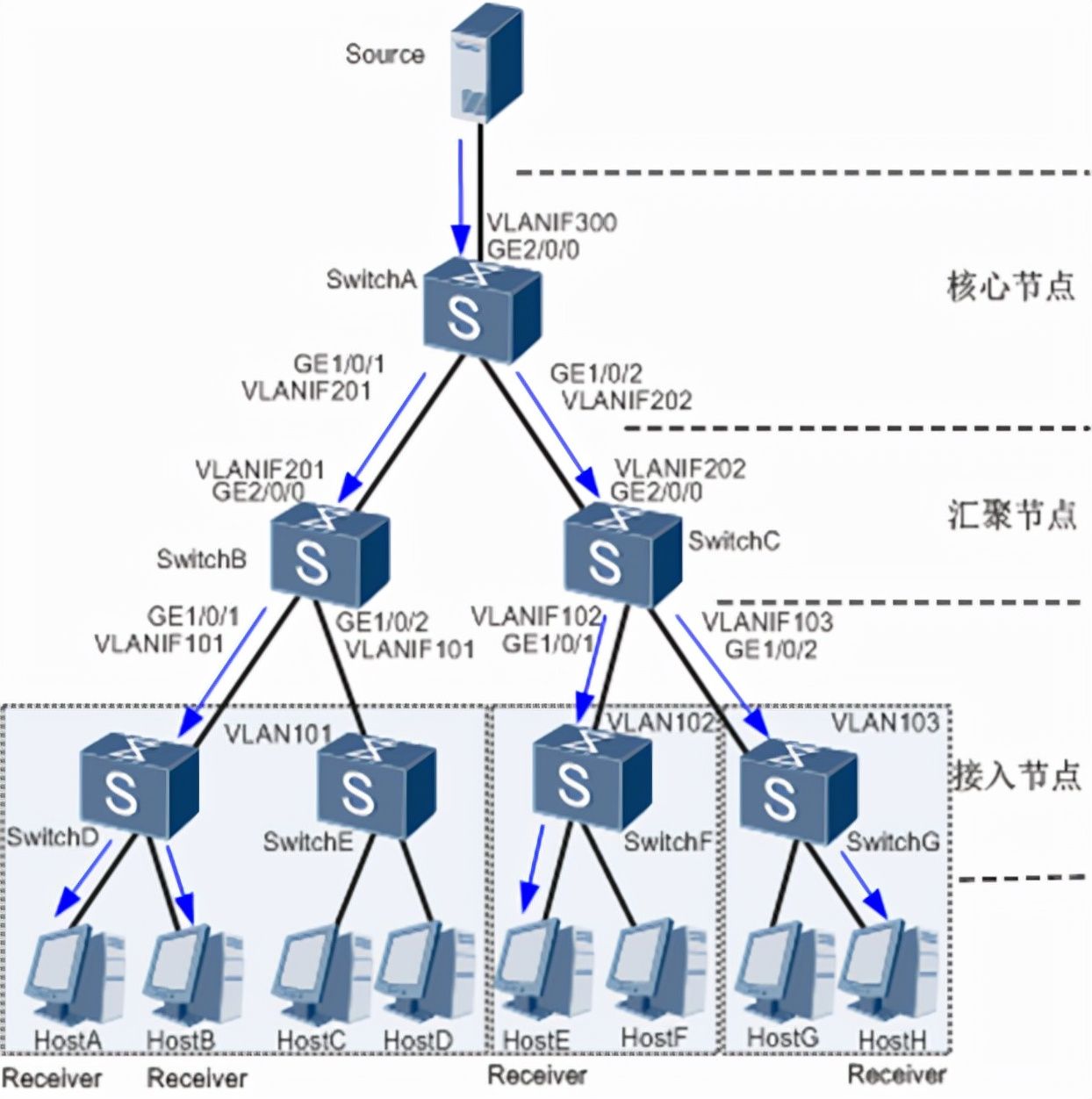 那么在一般的园区网中该如何部署组播业务呢?比如下图的一个树形网络,要想实现Source发送的组播数据到达下游的Receiver的目的,我们可以按照下面的思路去配置一个完备的组播网络。