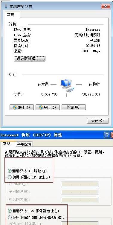 2、点击本地连接,再点击下方的“属性”,然后双击“Internet协议(TCP/IP)”,选择“自动获取IP地址”、“自动获得DNS服务器地址”。