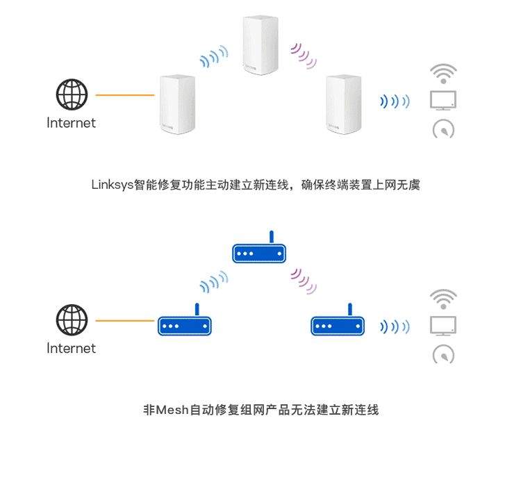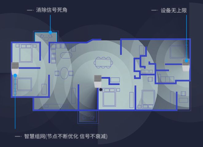 ▲现在越来越多的用户选择Mesh组网,优势就是简单配置,同时网络也非常的稳定,适合别墅,办公区域,复杂户型,通过简单的路由器配置就可以实现多区域无死角网络覆盖。