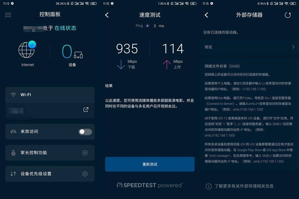 网络状态,家庭网络,在线设备,WIFI设置,家长控制,访客网络,媒体优先,外部存储等等。