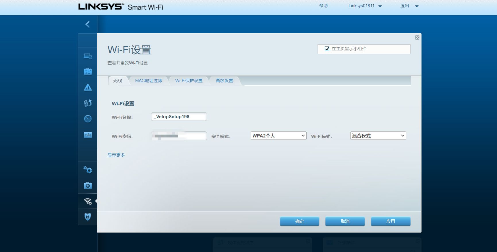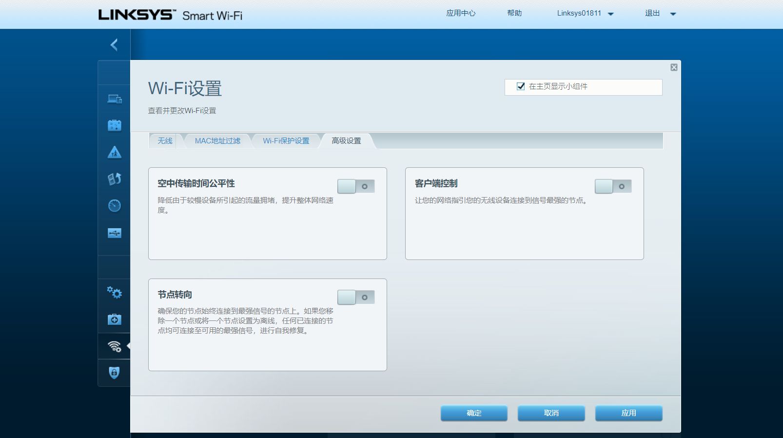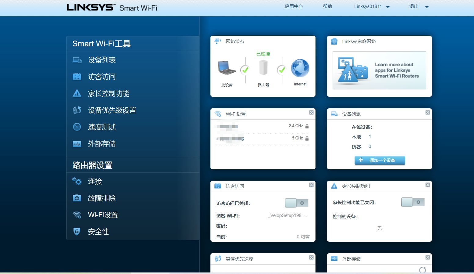 领势(LINKSYS)的MX4200的后台界面比较简单,相对于很多品牌真的简单多了,而常用的菜单和设置选项都可以选择作为小选项卡显示在主页面,为内置的默认选项卡包括
