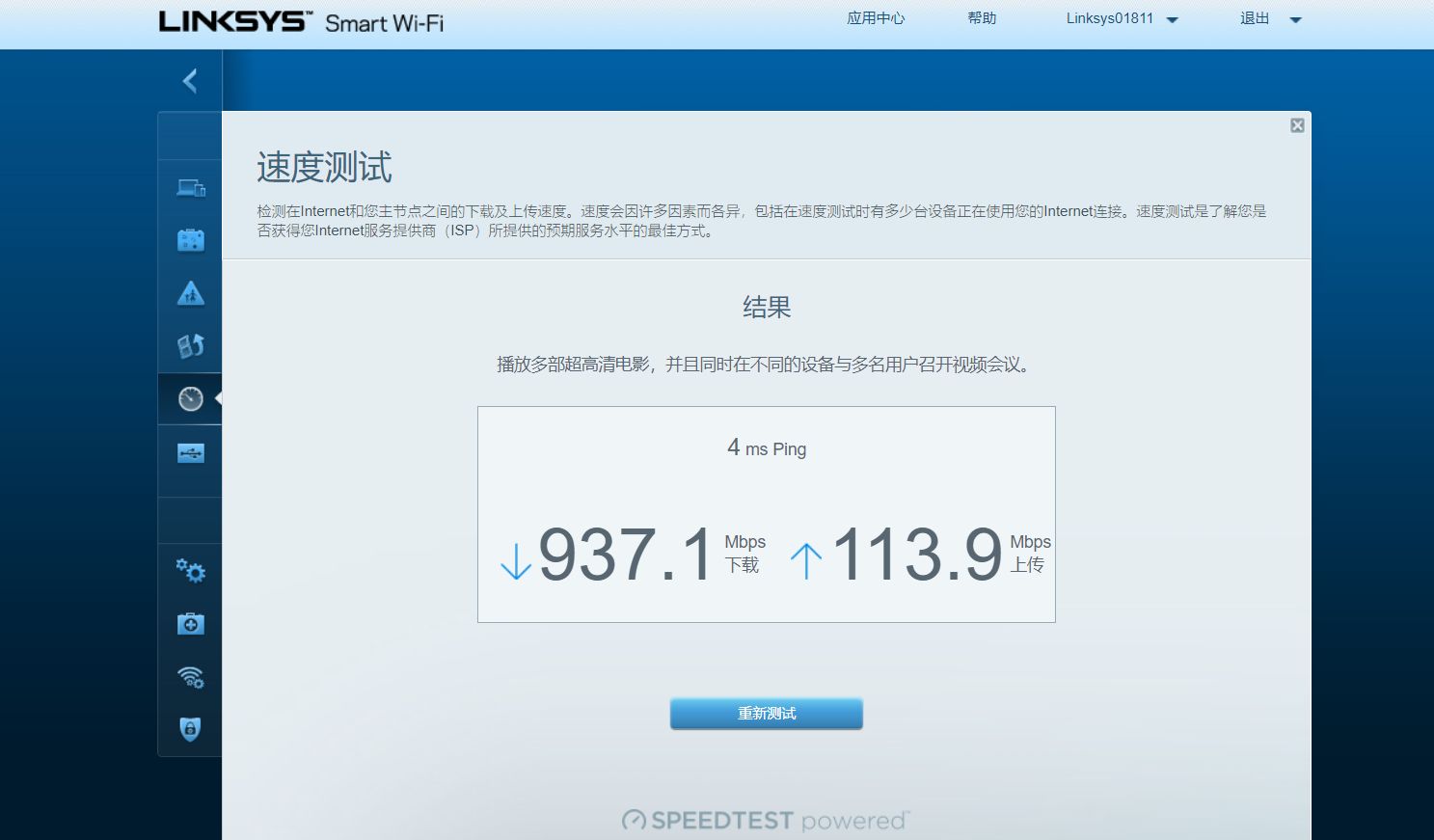 ▲对于小白来说,测试速度是最好的检测网络是否优质的指标没有之一,你说得再好网络在稳定,网速不能跑满。或者跑到足够的带宽都是说不过去的。而我家的千兆网络也是基本可以跑到600-900之间。使用手机的网卡来测试会有损失,电信来测试网速基本都是测试有线千兆网口的速度,无线的速度不做参考。