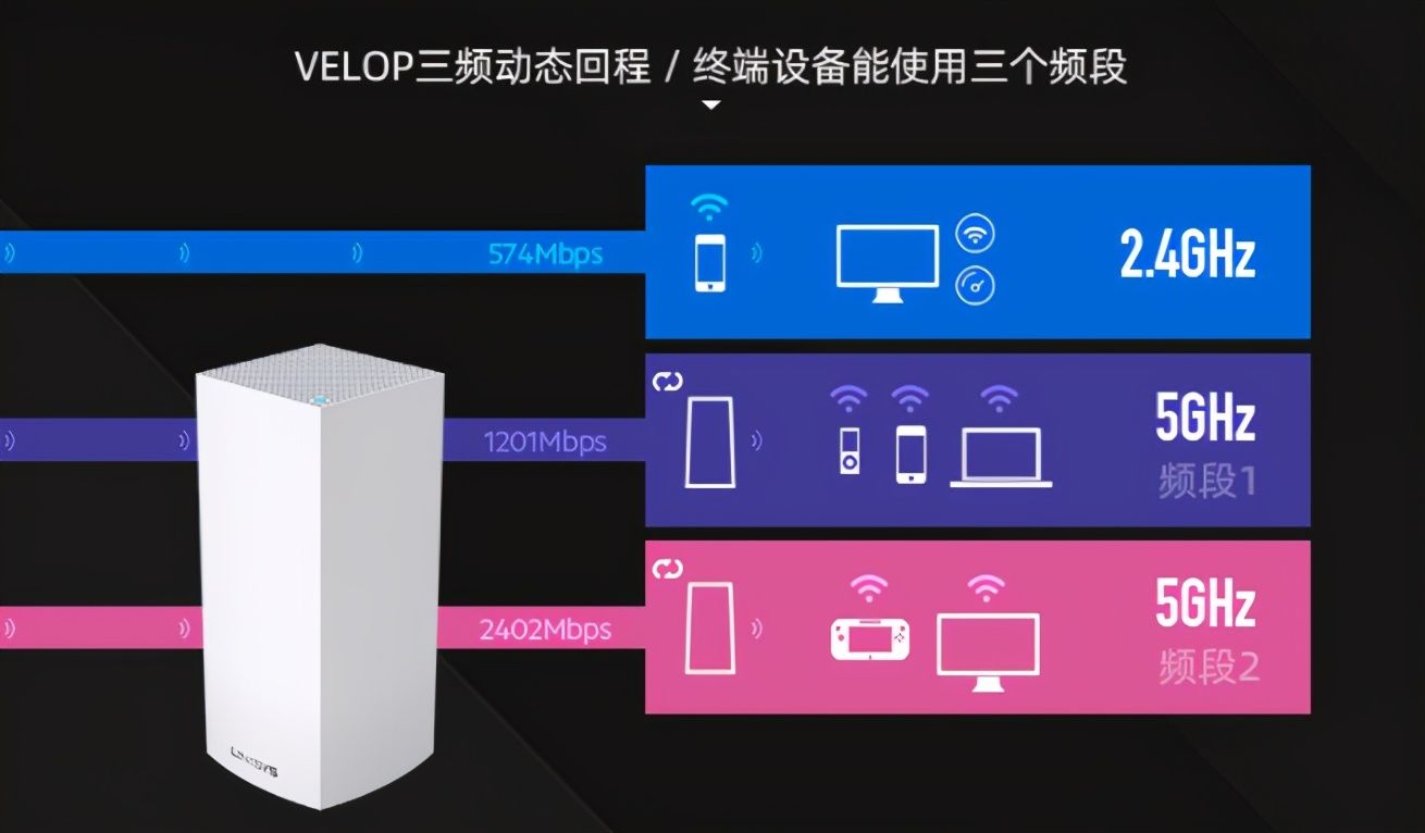 ▲设计简单,组网方便,不分主从路由,支持有线无线组网,三频并发,无线回车,,支持3组频段,2组5GHz和1组2.4GHz,无线回程状态下,会划分专用的回程频段,确保节点件的稳定连接和更佳的网速体验。